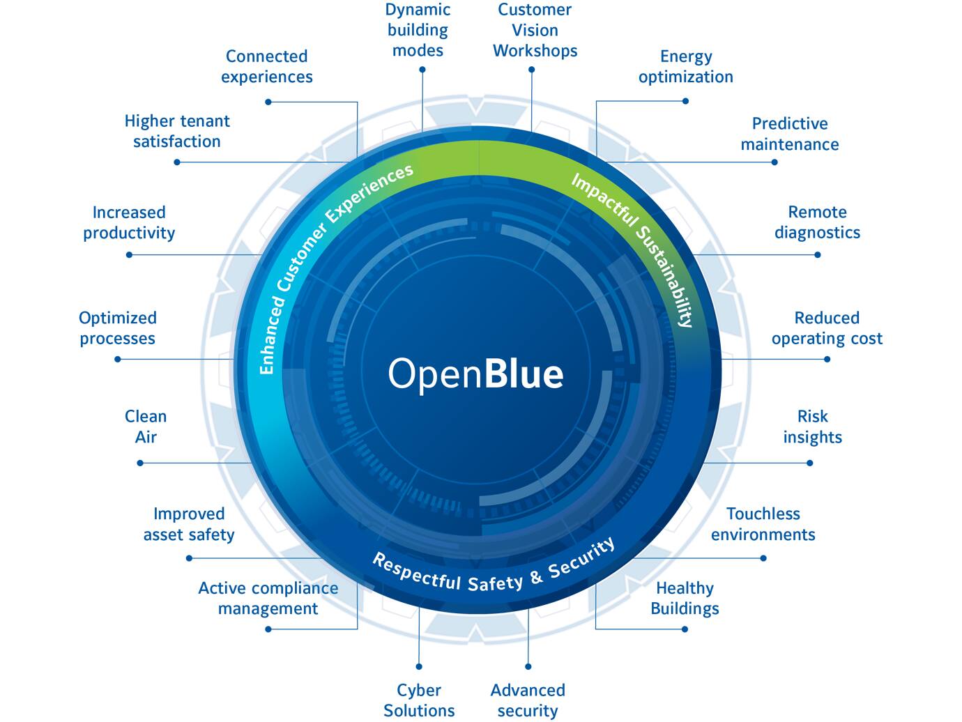 OpenBlue is a complete suite of connected solutions that delivers impactful sustainability, new occupant experiences, and respectful safety and security that combines our 135 years of building expertise with cutting-edge technology.